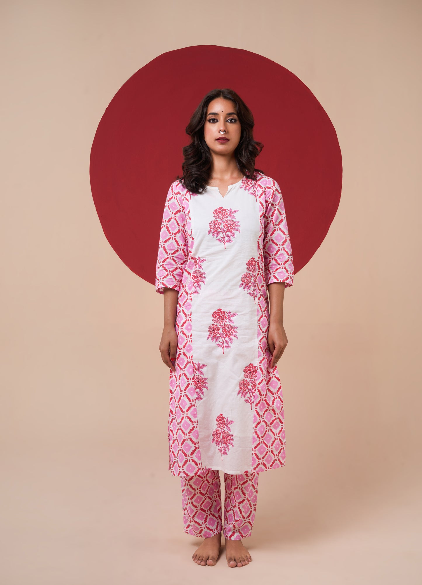 About the Carnation Pink Screen Print Cotton Kurta Set: