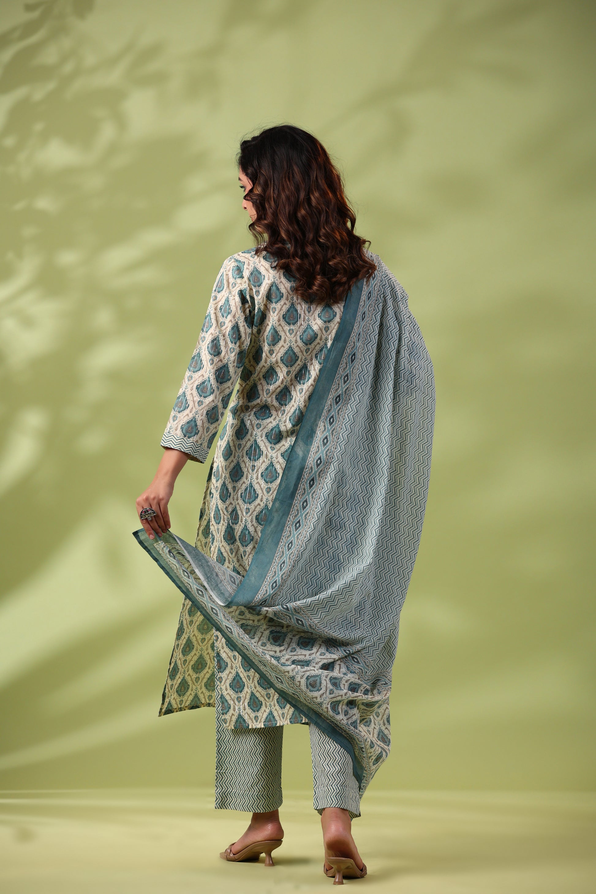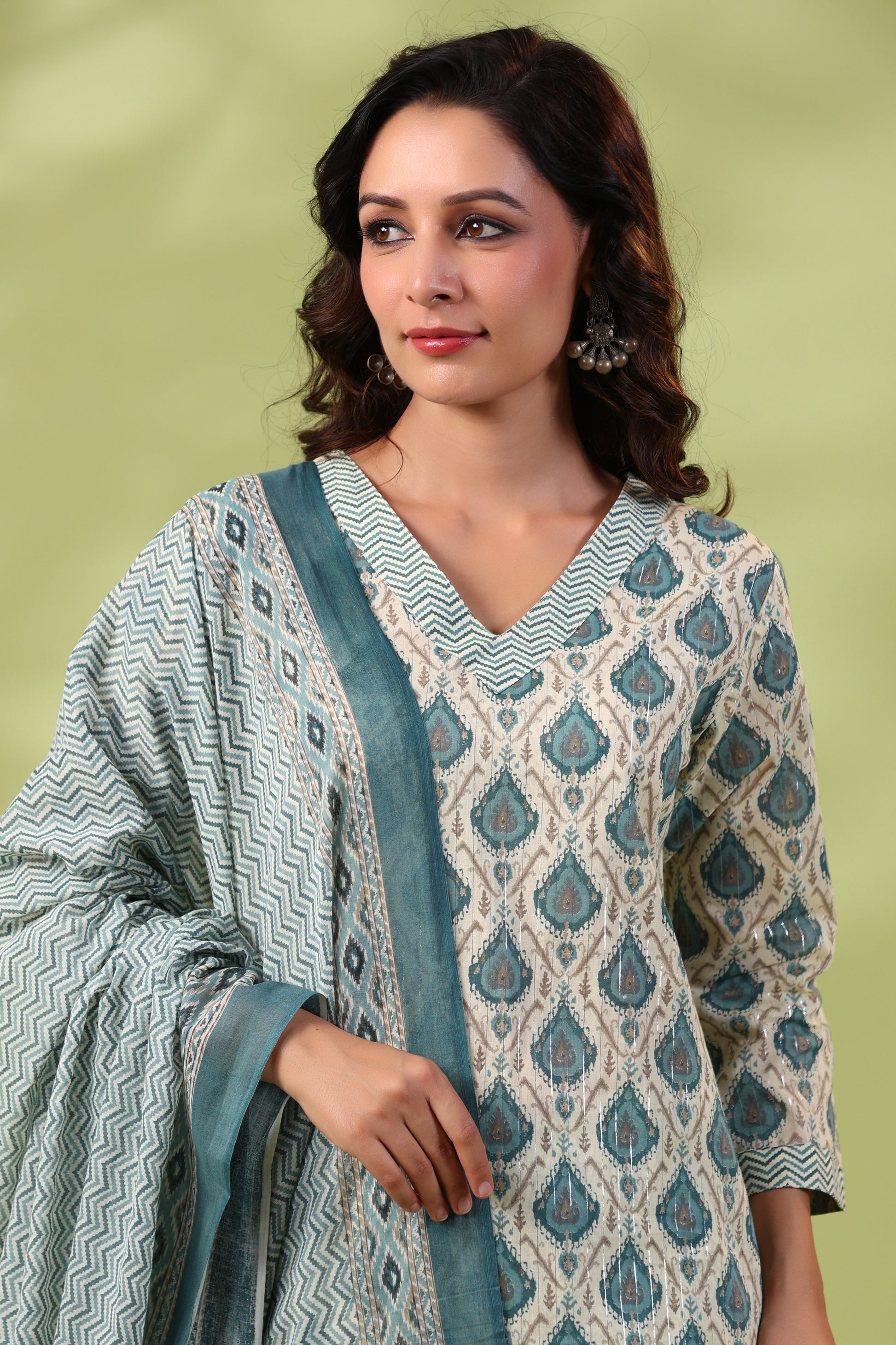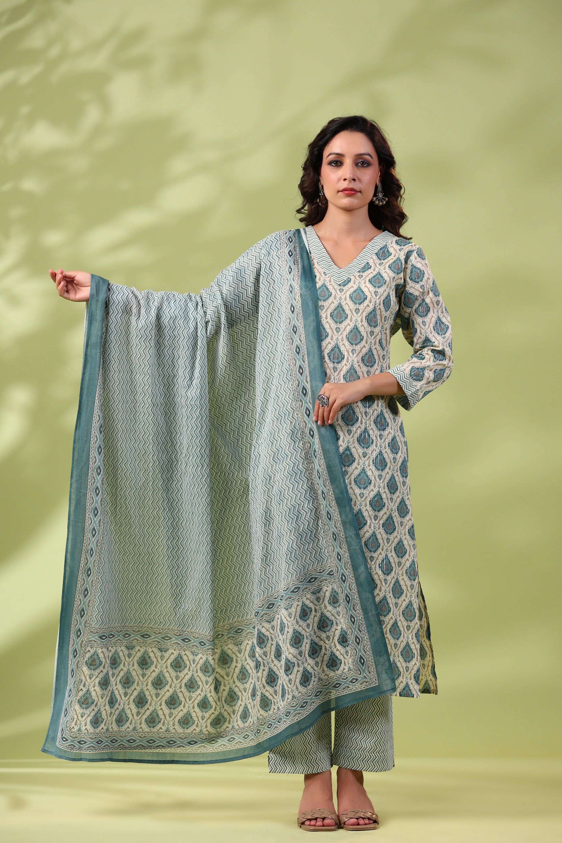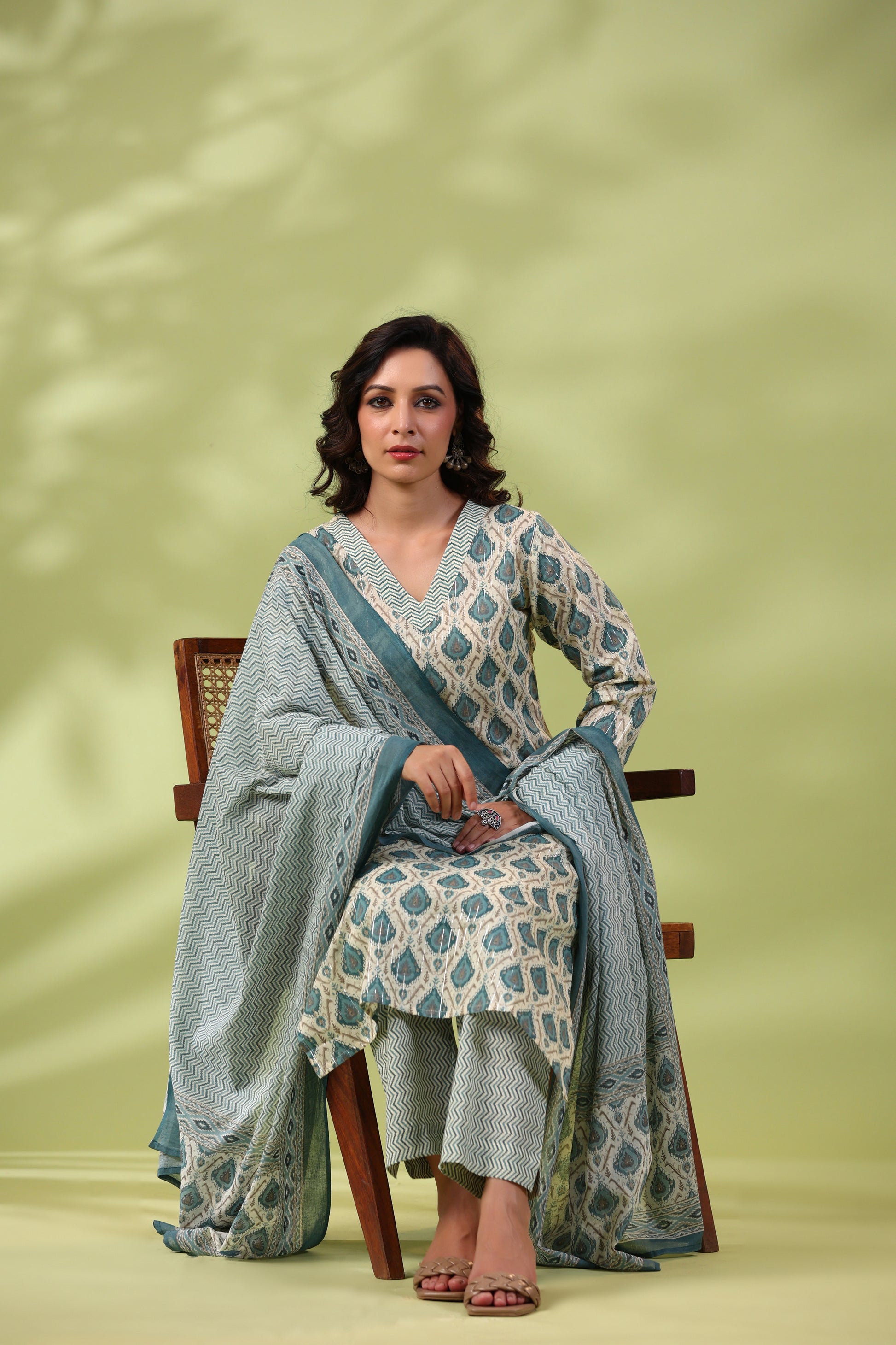 It is a 100 PC cotton 3 piece set. The dupatta is voil which is super soft cloth for summer. The suit is so comfortable and nice that I most frequently wear it to office. The bottom has a super comfortable elastic which makes is very wearable. It is a must add to wardrobe. Thankyou Sunehri Dhaga for bringing such pieces